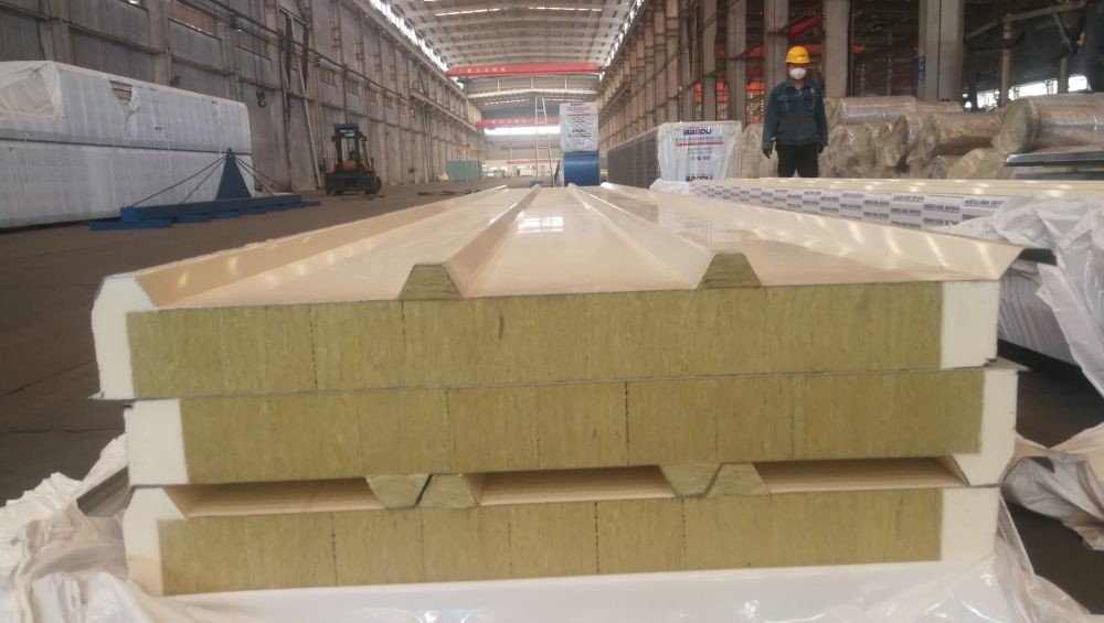Baodus Rockwool-Sandwich-Platte schließt 3 Schichten ein: das externe und das interne ist galvanisierte Stahlplatte, oder Aluminiumplatte, dort sind zwei Arten Mittellagen: eins ist reine rockwool Platte ohne Rand Pur oder Pir, während die andere reine rockwool Platte mit Rand Pur oder Pir ist.