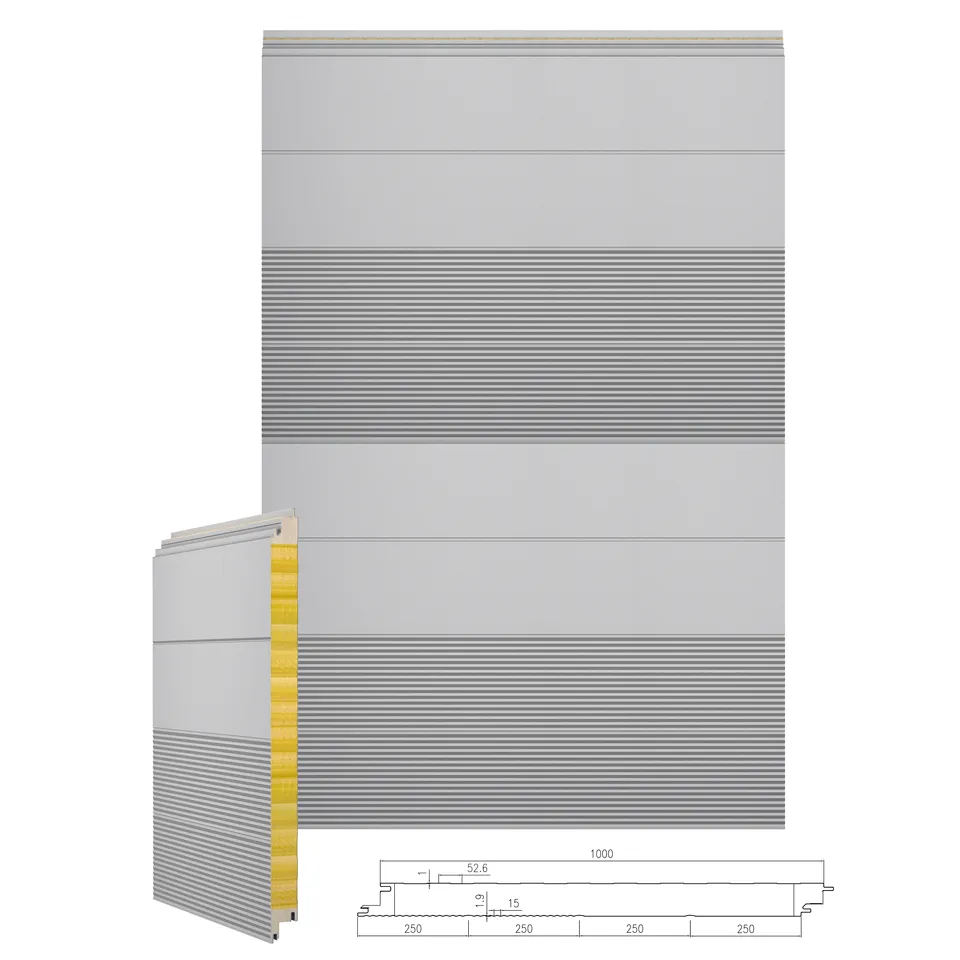 Die Panels bestehen aus zwei Schichten aus farbigen Stahlblechen mit einer Schicht aus Steinwollezellen dazwischen.während die Steinwolle ausgezeichnete thermische und akustische Dämmungseigenschaften aufweistDie Platten sind mit Zungen- und Rillenverbindungen ausgelegt, wodurch sie leicht zu installieren sind und eine dichte Dichtung zur Verhinderung von Luftlecks hergestellt werden.